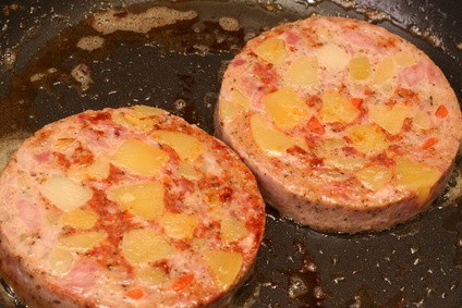 Zutaten: 62% Schweinefleisch, 26% Kartoffeln, Wasser, (Nitritpökelsalz, Konservierungsstoff E250), Stabilisator Natriumphosphat, Kräuter, frisch gemahlene Gewürze.